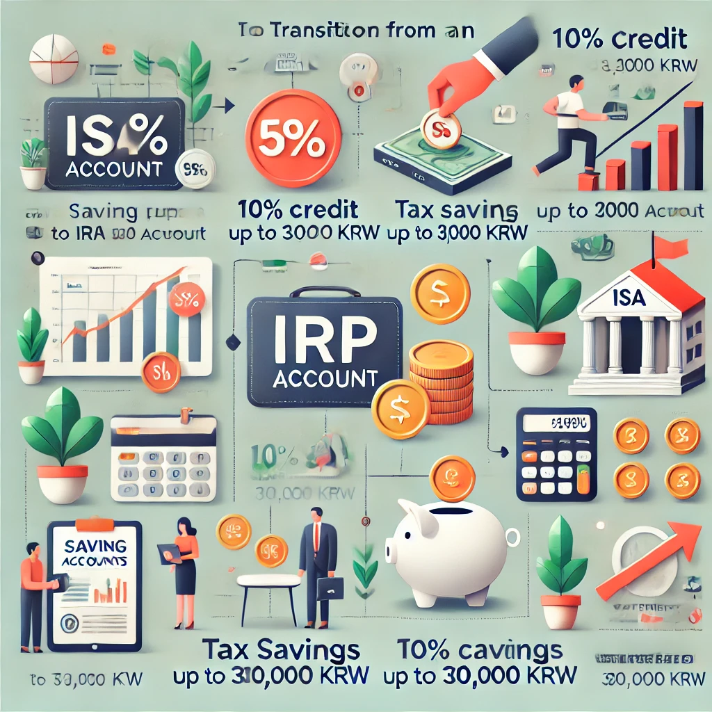 사회초년생이라면 ISA 계좌에 관심이 많으실 텐데요. ISA 계좌가 만기되면 연금 계좌로 전환하여 최대 300만 원까지 전환 금액의 10%를 세액공제 받을 수 있습니다. 만약 ISA 계좌 만기가 다가오고 있다면, IRP 계좌를 개설하거나 전환을 검토해 보시는 것도 좋은 선택입니다!